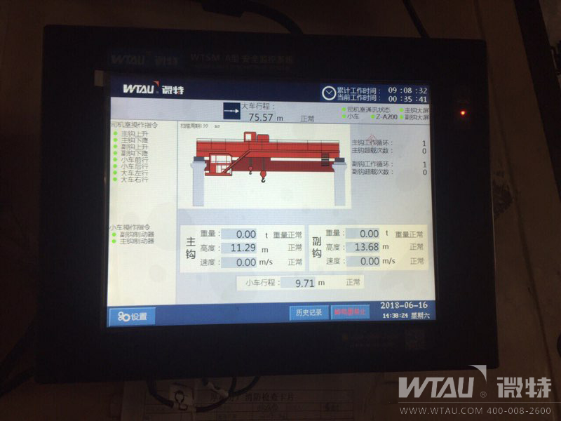 微特為大冶有色配備的WTSM-A型冶金橋式起重機安全監(jiān)控管理系統(tǒng),該系統(tǒng)具有實時監(jiān)控、動態(tài)顯示、聲光報警、數(shù)據(jù)備份、斷電記憶以及密碼保護等功能,且具有抗干擾性強,操行界面友好,通用性強等優(yōu)點。項目目前已得到當(dāng)?shù)刭|(zhì)監(jiān)局和使用方的驗收認可,業(yè)主對此次合作表示非常滿意。