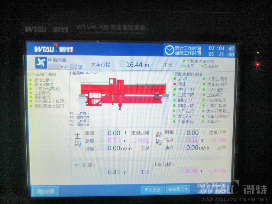 微特WTSM-A型起重機安全監(jiān)控系統(tǒng)具有實時監(jiān)控,動態(tài)顯示,聲光報警,數(shù)據(jù)存儲,斷電記憶以及密碼保護(hù)等功能,且儀表本身設(shè)計具有抗干擾性強,操作界面方面,通用性強等優(yōu)點。經(jīng)過微特技術(shù)工程師的現(xiàn)場安裝調(diào)試完后順利通過了客戶及當(dāng)?shù)靥貦z機構(gòu)的驗收,贏得了客戶的認(rèn)可,也為我們今后在淄博地區(qū)業(yè)務(wù)的深入開展起到了一個良好的開端。