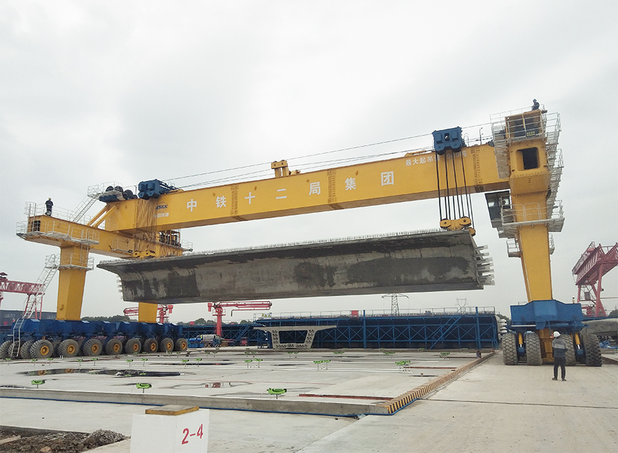江陰制梁場制架箱梁785孔;江陰鋪軌基地全線鋪新軌604.41鋪軌公里,鋪道岔123組;江陰站站房9370.94平方米。每次吊裝及運(yùn)輸再到高架橋的鋪架都需要相應(yīng)的設(shè)備,最初就需要大型提梁機(jī)將重達(dá)800噸的箱梁提到運(yùn)梁車上,然后再運(yùn)到橋墩通過架橋設(shè)備鋪架到橋墩上。
