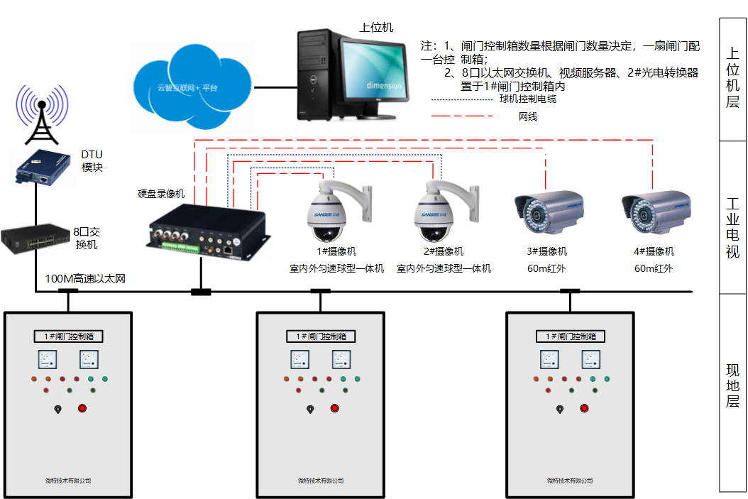 由微特為客戶(hù)提供的技術(shù)解決方案,全系統(tǒng)采用4套閘門(mén)現(xiàn)地操作箱和一套可編程控制單元及相關(guān)配套通信設(shè)施。采用可編程控制器控制方式設(shè)計(jì)?,F(xiàn)地控制單元完成對(duì)閘門(mén)的數(shù)據(jù)采集及數(shù)據(jù)預(yù)處理,負(fù)責(zé)通過(guò)網(wǎng)絡(luò)傳送數(shù)據(jù)信息,并自動(dòng)服從上位機(jī)的命令和管理。