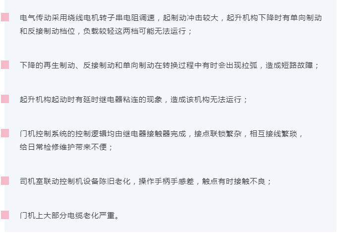 金銀臺樞紐1250T雙向門機(jī)電氣控制系統(tǒng)于2012年投運至今已有8年,控制系統(tǒng)元器件老化,部分元器件已停產(chǎn),無法提供備件,控制線路老化,可靠性降低,影響設(shè)備安全運行,無法滿足設(shè)備安全生產(chǎn)的需要。原控制系統(tǒng)設(shè)計性能差,操作系統(tǒng)容易出故障,啟動沖擊較大,平穩(wěn)性差。據(jù)現(xiàn)場調(diào)研主要存在以下問題: