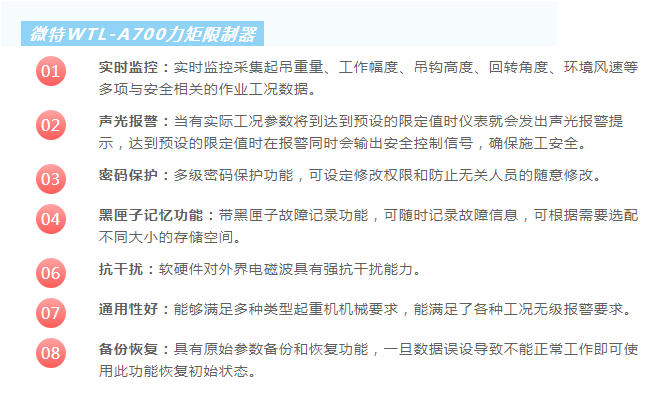 此次為佛山高明珠碼頭合作的全幅式門座機安裝的WTL-A700起重機力矩限制器為微特自主設計研發(fā)生產(chǎn)的產(chǎn)品,是一款多功能、高性能、智能人機交互的高端起重機安全監(jiān)控裝置,適用于電吊、固定吊等起重設備。