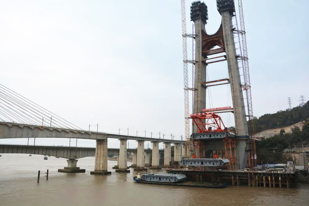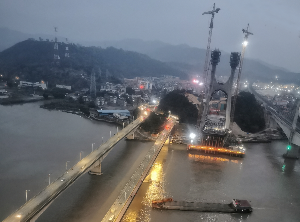 其中烏龍江特大橋位于福州倉山區(qū)和閩侯縣境內,其下游約220米就是324國道烏龍江公路橋,全長868.188米,跨324國道和烏龍江。本橋為雙線橋,全長868.178米,共計14個墩臺,總投資約1.33億元。該橋采用雙線矩形空心橋臺,主跨為(144+288+144)米部分斜拉橋,為世界范圍內同類橋型最大跨度。