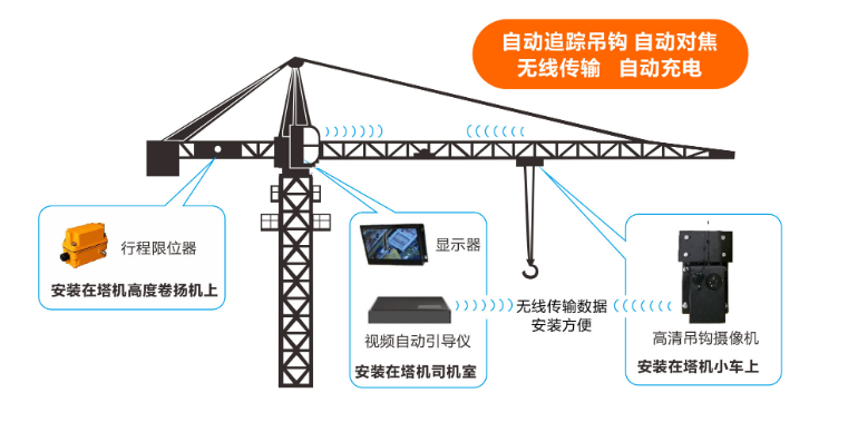 將攝像機安裝在塔式起重機大臂的最前端或者吊鉤上方,拍攝區(qū)域不會被其它物體遮擋,鏡頭可自動追蹤吊鉤,自動對焦,司機可清晰的看到拍攝畫面,根據拍攝畫面自主判斷吊裝情況,結合信號員的引導達到雙保險的效果。