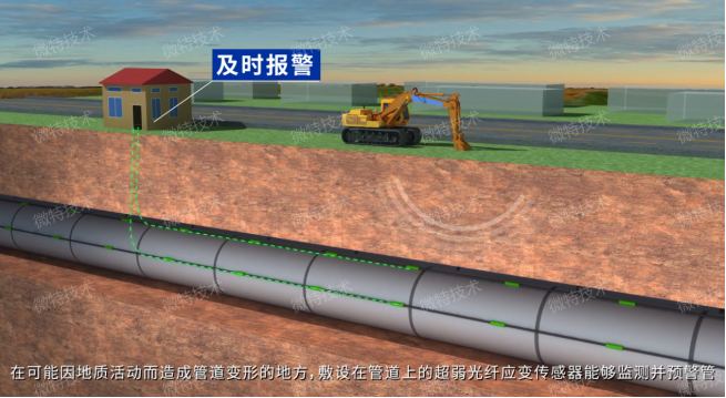 在敷設(shè)管道上安裝光纖應(yīng)變傳感器能夠監(jiān)測(cè)并預(yù)警管道樞軸或屈曲的發(fā)展變化,同時(shí)以米級(jí)的定位精度通知閥室的管理人員。為了第一時(shí)間檢測(cè)出微小的泄漏,最大限度降低對(duì)環(huán)境的破壞,根據(jù)管道傳輸物質(zhì)的不同液體,溫度感測(cè)光纜對(duì)應(yīng)敷設(shè)在管道的不同位置,通過監(jiān)測(cè)周圍土壤溫度的異常,來(lái)判斷管道是否發(fā)生泄漏,不管是泄漏引起的還是外界環(huán)境變化造成的都能即時(shí)發(fā)現(xiàn)。