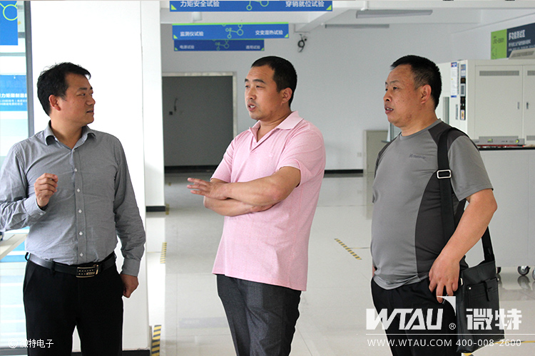 微特電子總經(jīng)理聶道靜對(duì)兩位遠(yuǎn)道而來(lái)的貴客表示歡迎,微特水電事業(yè)部經(jīng)理韓信與技術(shù)工程師劉普文向郭永崗、田國(guó)強(qiáng)詳細(xì)介紹了微特電子的發(fā)展歷程及產(chǎn)品技術(shù)。同時(shí)還一同來(lái)到微特建設(shè)的智能吊裝設(shè)備研發(fā)檢測(cè)中心,參觀高溫老化實(shí)驗(yàn)機(jī)、雷擊浪涌、靜電測(cè)試、振動(dòng)實(shí)驗(yàn)等實(shí)驗(yàn)檢測(cè)設(shè)備。這些實(shí)驗(yàn)設(shè)備是微特電子高品質(zhì)產(chǎn)品的保證,確保每一臺(tái)出廠的設(shè)備都是百分百合格。