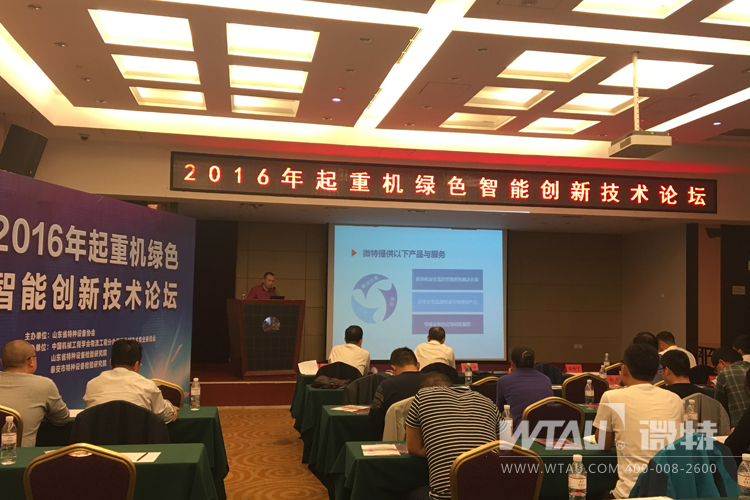 2016年起重機(jī)綠色智能創(chuàng)新技術(shù)論壇于10月19日-22日在山東省泰安市舉辦。本次論壇的主題為“綠色,智能,創(chuàng)新”。由山東省特種設(shè)備協(xié)會聯(lián)合中國機(jī)械工程學(xué)會物流工程分會起重機(jī)械技術(shù)專業(yè)委員會、山東省特種設(shè)備檢驗(yàn)研究院、泰安市特種設(shè)備檢驗(yàn)研究院共同主辦。受主辦方邀請,微特電子在會上作了“起重機(jī)安全智能監(jiān)控系統(tǒng)”的主題演講。