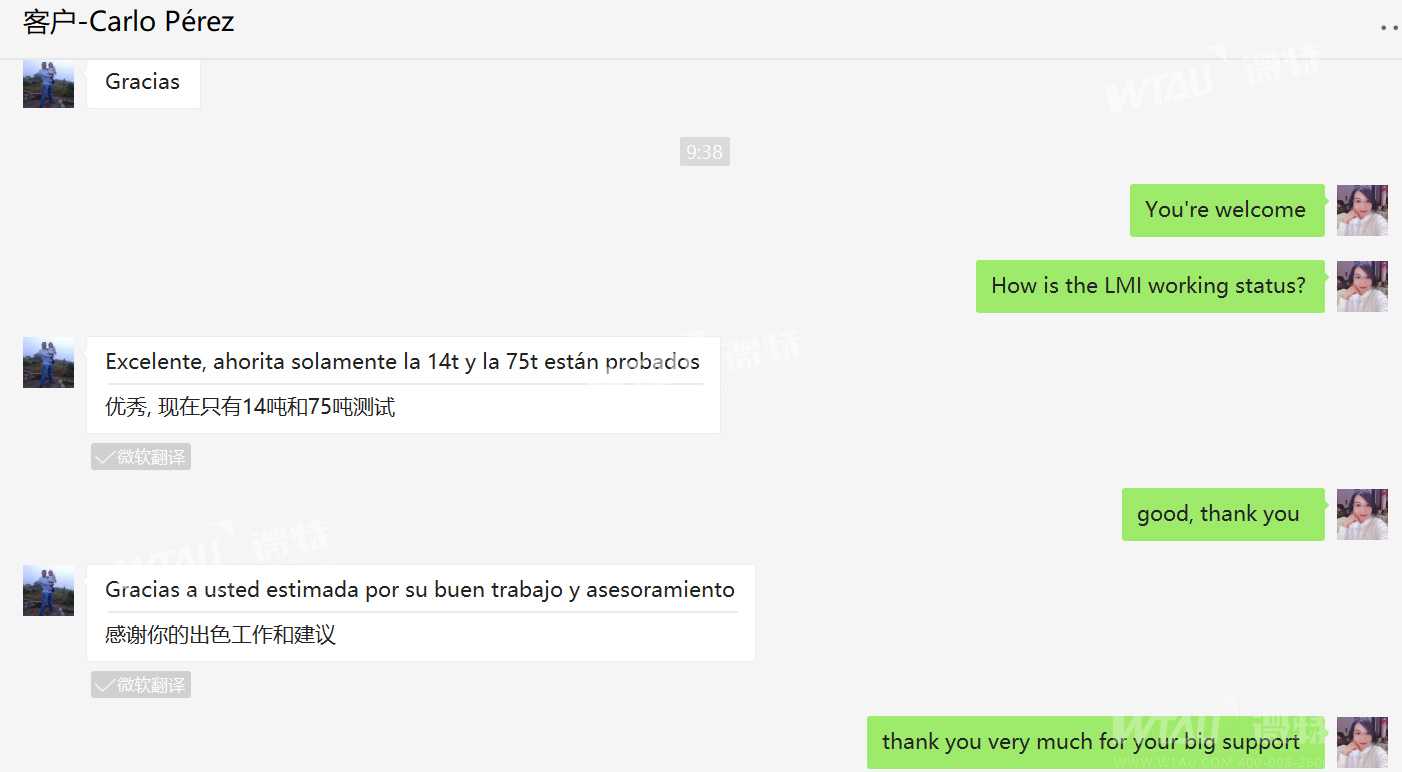 微特外貿(mào)經(jīng)理Riki收到來(lái)自中美洲尼加拉瓜客戶(hù)CARLO對(duì)微特力矩限制器產(chǎn)品的反饋, 并發(fā)來(lái)部分客戶(hù)自己安裝調(diào)試的產(chǎn)品圖片及吊車(chē)現(xiàn)場(chǎng)工作圖片。此次合作,微特協(xié)助客戶(hù)在14T隨車(chē)吊上安裝了WTL-A200力矩限制器以及在75T汽車(chē)吊安裝了WTL-A700型力矩限制器。 跟蹤產(chǎn)品使用狀態(tài)時(shí),客戶(hù)給出了非常滿(mǎn)意的答復(fù)并對(duì)微特外貿(mào)經(jīng)理的合理選型及溝通建議表示感謝!