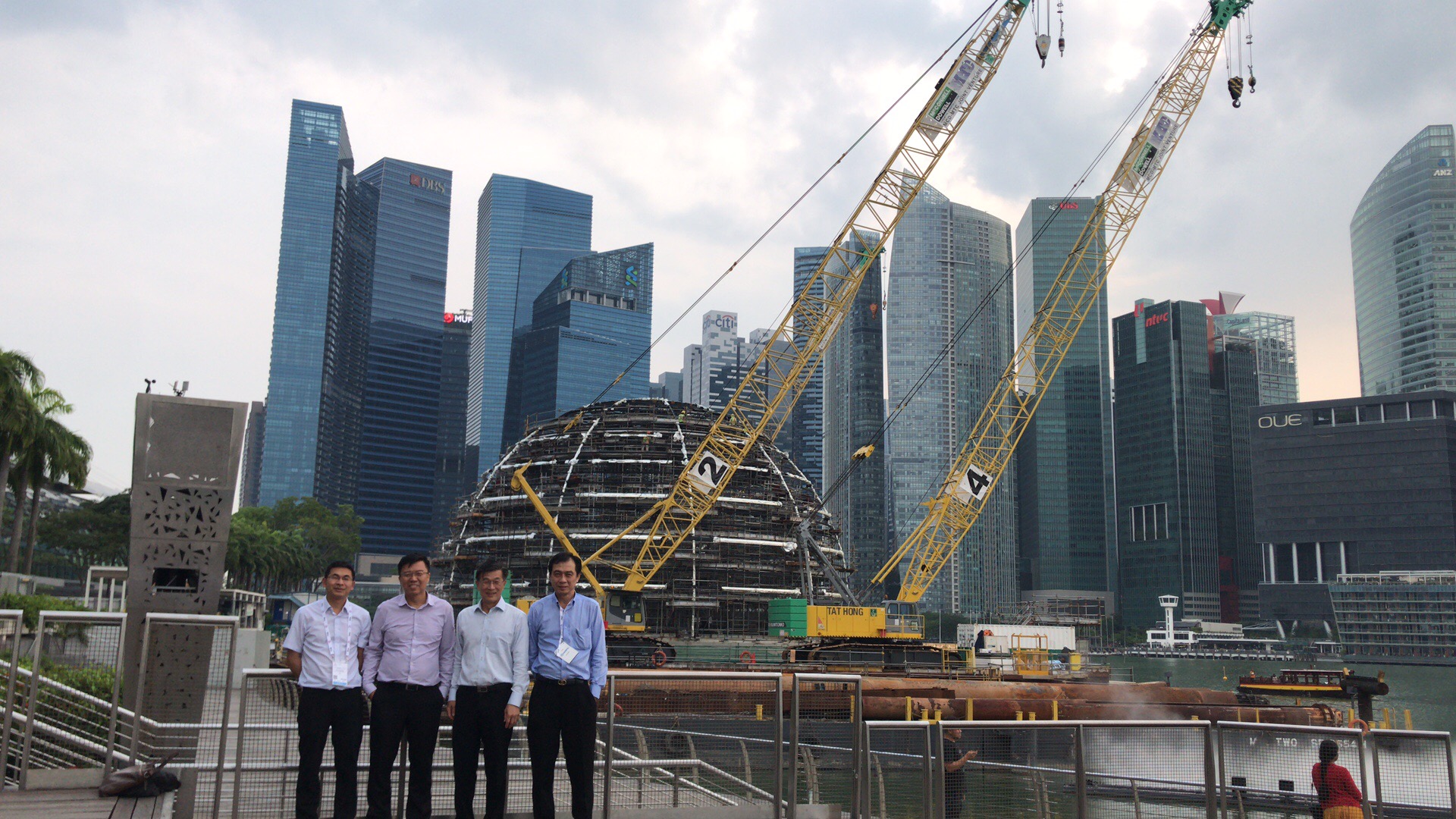 ▲微特事業(yè)部總經(jīng)理與新加坡達(dá)豐公司在會(huì)場(chǎng)外的工地現(xiàn)場(chǎng)合影,背后正在施工的吊車上安裝的正是微特的力矩限制器產(chǎn)品