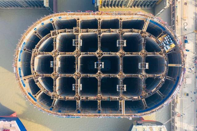 5號(hào)、6號(hào)墩鋼沉井每個(gè)用鋼量達(dá)1.8萬(wàn)噸,沉井底面長(zhǎng)95米,寬57.8米,總高72米,為世界在建最大水上沉井基礎(chǔ) 。