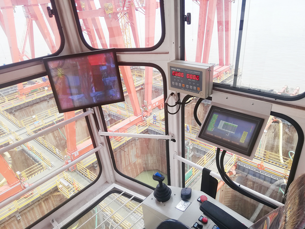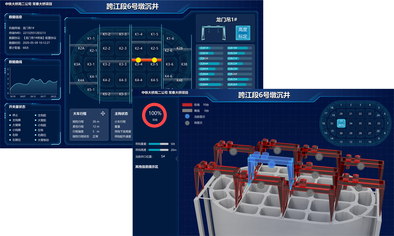 微特今年下半年與項(xiàng)目部多次溝通,與總工反復(fù)進(jìn)行技術(shù)協(xié)商及推演,最終決定使用龍門(mén)吊來(lái)監(jiān)測(cè)泥面高度,通過(guò)三維定位龍門(mén)吊的方案,找到每個(gè)龍門(mén)吊在沉井上的坐標(biāo),再結(jié)合卷?yè)P(yáng)機(jī)的高度變化,來(lái)實(shí)現(xiàn)每日單天每個(gè)井孔的最大深度測(cè)量,達(dá)到自動(dòng)測(cè)量自動(dòng)生產(chǎn)數(shù)據(jù)報(bào)表功能,使得沉井下沉高度自動(dòng)可視可測(cè)。