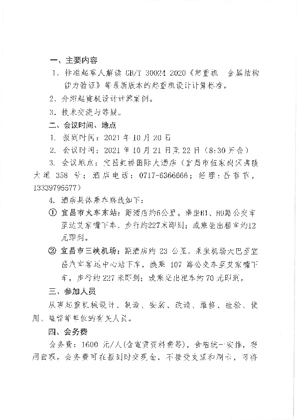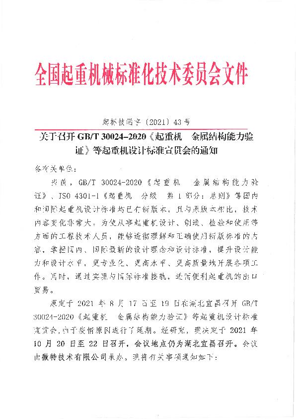 原定于2021年8月18日至19日在宜昌召開的全國(guó)起重機(jī)械標(biāo)準(zhǔn)化技術(shù)委員會(huì)組織的關(guān)于GB/T 30024-2020《起重機(jī) 金屬結(jié)構(gòu)能力驗(yàn)證》等起重機(jī)設(shè)計(jì)標(biāo)準(zhǔn)宣貫會(huì),由于疫情原因進(jìn)行了延期。經(jīng)組委會(huì)研究決定將于2021年10月20日至22日仍在宜昌召開此次會(huì)議。