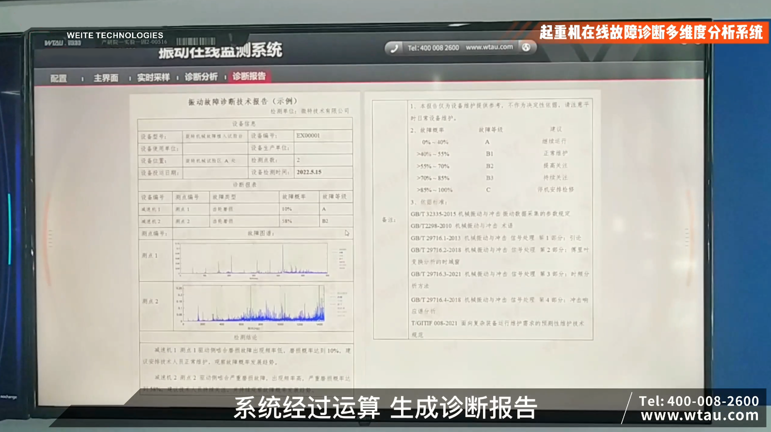 當(dāng)運(yùn)算完成自動(dòng)生成診斷報(bào)告, 我們可以在診斷報(bào)表中看到減速機(jī)一齒輪磨損概率10%,故障等級(jí)A等。減速機(jī)二齒輪磨損故障概率58%,故障等級(jí)B2等。在“檢測(cè)結(jié)論”欄中分別對(duì)兩臺(tái)減速機(jī)進(jìn)行了故障描述并給出實(shí)施建議。