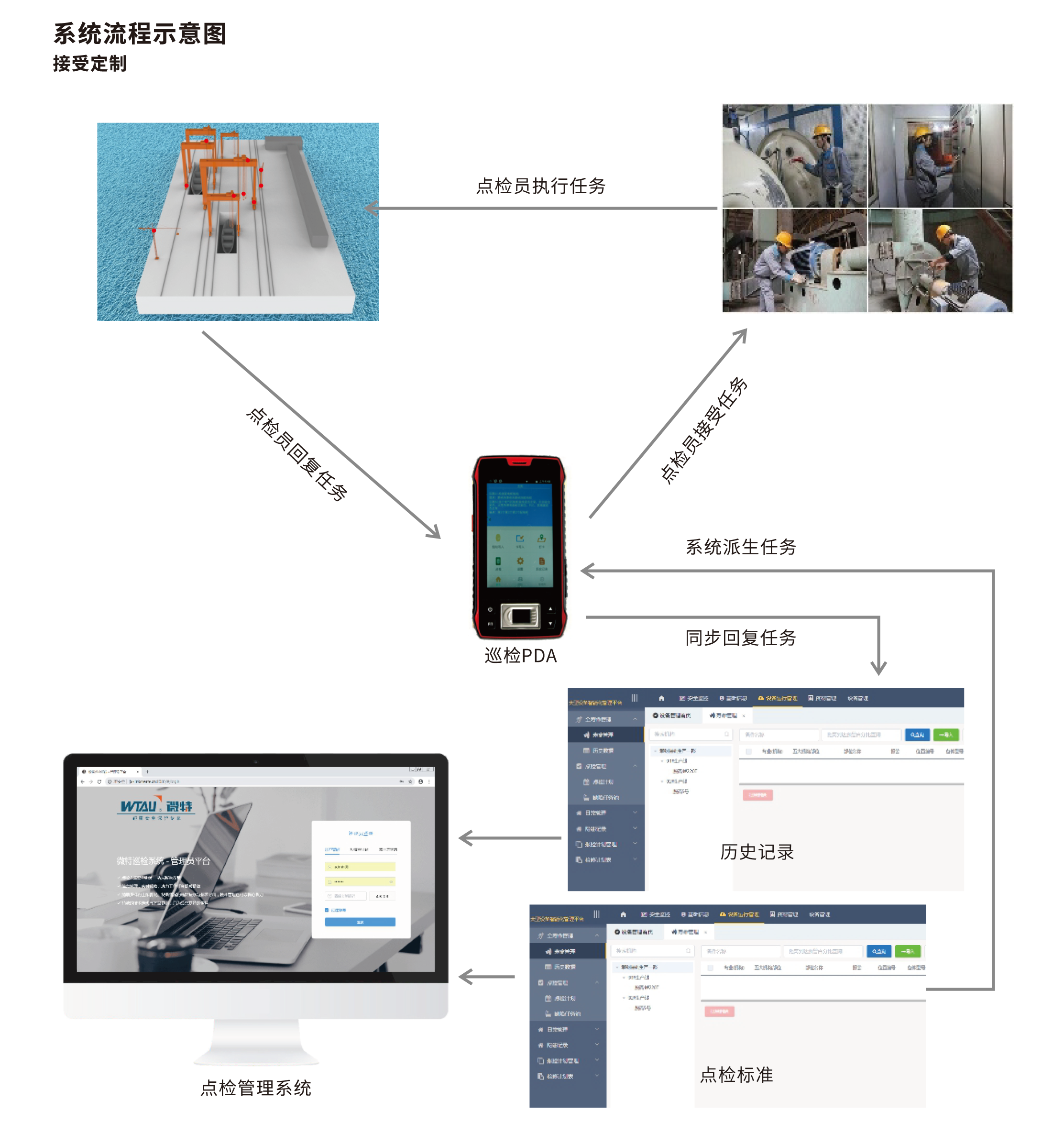 WT-SMS-V2.0設(shè)備點檢系統(tǒng)是結(jié)合船廠起重機實際生產(chǎn)點檢標準及管理積累經(jīng)驗,設(shè)計生產(chǎn)的一款產(chǎn)品。