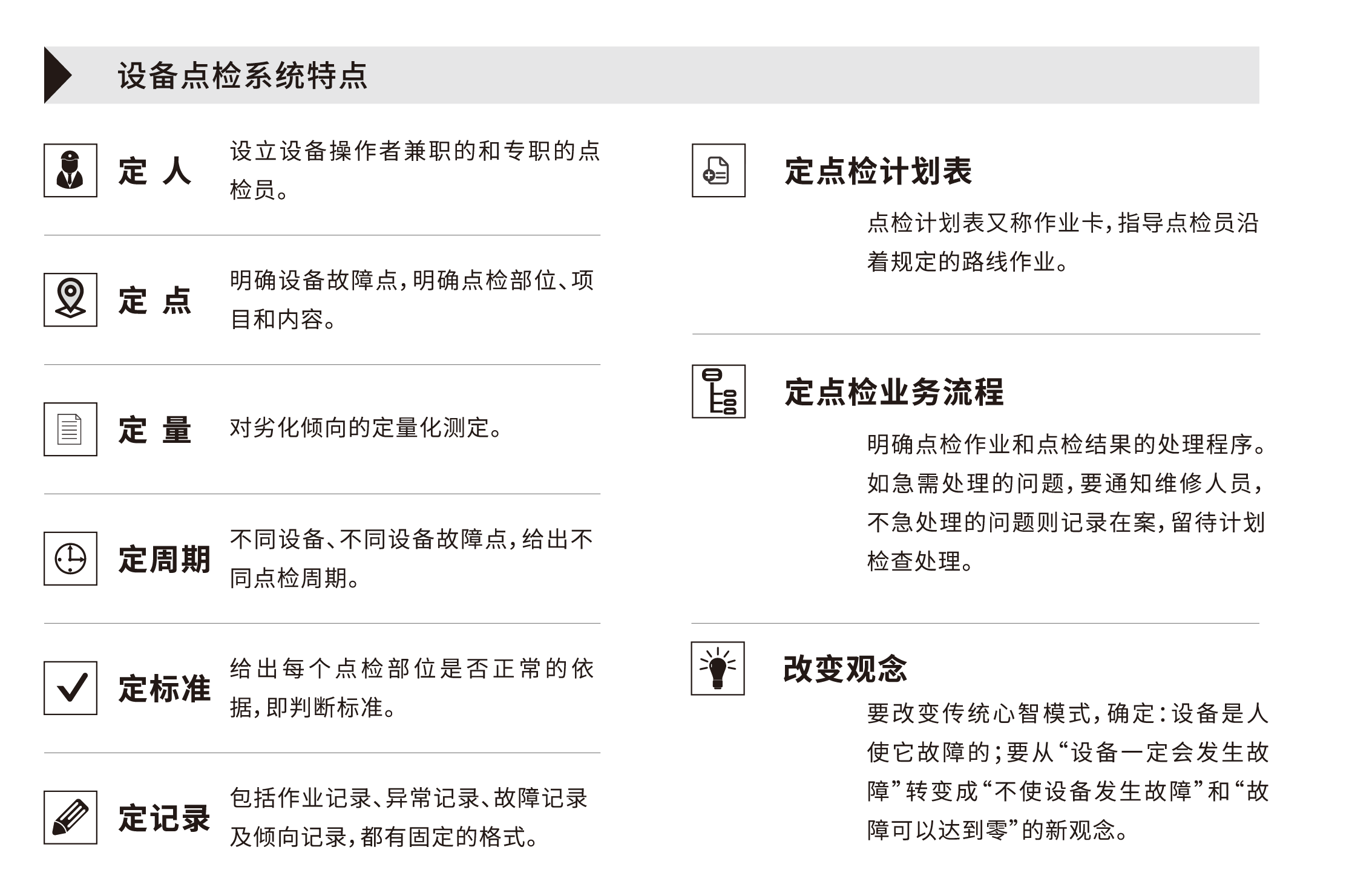 點檢是車間設(shè)備管理的一項基本制度,目的是通過點檢準確掌握設(shè)備技術(shù)狀況,維持和改善設(shè)備工作性能,預(yù)防事 故發(fā)生,減少停機時間,延長設(shè)備壽命,降低維修費用,保證正常生產(chǎn)。